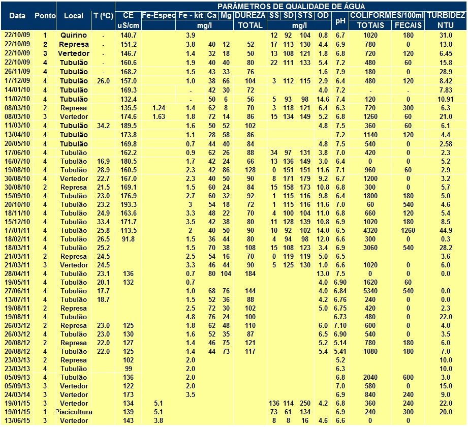 distintos (represa e após o vertedor ou canal do córrego), cujos resultados das análises estão no quadro abaixo, que contém também os resultados das análises das aulas práticas anteriores, permitindo a comparação no tempo da qualidade da água do manancial.