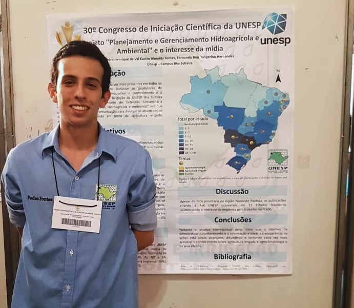 -------------------------------------------------------------------------------------------------- Sob Orientação do Professor Dr. Fernando Braz Tangerino Hernandez, um dos orientados da Área de Hidráulica e Irrigação da UNESP Ilha Solteira participaram do XXX CIC - Congresso de Iniciação Científica da UNESP no dia 19 de setembro de 2018. PARTICIPAÇÃO DA ÁREA DE HIDRÁULICA E IRRIGAÇÃO O estagiário apresetenou o seu trabalho no CIC esta cursando a graduação em Agronomia: Veja outras participações da Área de Hidráulica e Irrigação da UNESP no CIC e demais eventos aqui.