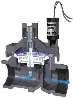 | É uma válvula selecionadora, ativada pela pressão da rede, que fecha a entrada do filtro e abre a saída do fluxo de lavagem, causando um fluxo reverso no filtro. | ||||||||||||||||||||||||||||||