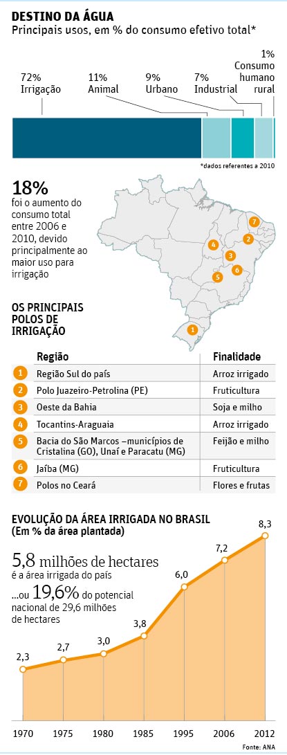 De cada cem litros de água consumidos no país, 72 são utilizados na agricultura. O alto volume necessário para a produção de alimentos colocou a irrigação no alvo das medidas que podem ser adotadas em alguns Estados para evitar o desabastecimento nos centros urbanos. Diante da gravidade da crise, há quem avalie que essa restrição é necessária. Para outros especialistas, porém, a irrigação não pode ser considerada a vilã da crise atual. O consumo agrícola de água no Brasil está em linha com a média mundial, de 70%. Segundo a ANA (Agência Nacional de Águas), os EUA e a Austrália apresentam percentual semelhante. Na China, a irrigação responde por 90% do total. Mesmo longe do seu potencial de irrigação, de 29,6 milhões de hectares, o consumo é alto em comparação com o urbano, que responde por 9% do total, e o industrial (7%). Segundo Jorge Werneck Lima, pesquisador em hidrologia da Embrapa Cerrados, com boas práticas de manejo agrícola é possível economizar ao menos 20% da água consumida nas fazendas. A presidente da ABRH (Associação Brasileira de Recursos Hídricos), Jussara Cruz, diz que qualquer redução no uso da água pela agricultura pode gerar sobras para muitas residências. O tamanho dessa redução, no entanto, depende da cultura e da localização da plantação irrigada. As áreas que mais precisam de gerenciamento, segundo ela, são as localizadas próximas aos mananciais que abastecem as grandes cidades. CONFLITO O tema é polêmico. "Não há um conflito entre a água para beber e a utilizada na agricultura", diz Fernando Braz Tangerino Hernandez, titular da área de irrigação da Unesp Ilha Solteira. Segundo especialistas, é preciso considerar que parte da água utilizada pela agricultura retorna à atmosfera pelo processo natural de evapotranspiração -evaporação da água presente nas camadas superficiais do solo e a transpiração das plantas, que ocorre nas folhas. "A água passa pela planta e volta", afirma Tangerino. Além disso, os ganhos de produtividade proporcionados pela irrigação inibem o avanço da agricultura para áreas ainda não ocupadas pelo setor, contribuindo para a preservação do ambiente. Para Luís Henrique Bassoi, pesquisador da Embrapa Semiárido, o produtor também se beneficia. Com a irrigação, o agricultor pode obter mais rentabilidade e maior segurança quanto à obtenção da colheita e até mesmo de colher em uma mesma área mais de uma vez por ano. Caso seja necessária a imposição de um limite no uso da água para irrigação, a presidente da ABRH diz que é preciso adotar medidas compensatórias aos produtores que deixarão de produzir e ficarão sem renda. "Algumas pessoas não podem pagar sozinhas pela crise", afirma. Bassoi destaca que "o custo de não se irrigar" para obter uma melhor produção não se restringe apenas à perda de produção agrícola, mas na geração de renda e empregos. Especialistas e produtores dizem que há espaço para economizar De especialistas a produtores, todos concordam que há espaço para melhorar o uso da água na agricultura. Sergio Pitt, produtor de grãos no oeste da Bahia, diz que é necessária uma política de gestão na propriedade. Essa política tem de incluir um aproveitamento maior das águas em período de boa vazão, mas uma redução da utilização quando os rios estão com níveis críticos. A produtividade do período de boa vazão compensa a menor rentabilidade do período ruim, segundo ele. As boas práticas já levam produtores de arroz irrigado no Sul a reduzir o consumo de água entre 30% e 40%. Para melhorar a irrigação, Bassoi, da Embrapa, destaca que é necessária uma agenda comum "mais entrosada" das instituições que trabalham sobre o tema água. Tangerino afirma que faltam planejamento e gestão nos governos municipais, estaduais e federal. "Nossa matéria-prima é a chuva -ao contrário de alguns países que têm o degelo- e temos de buscar meios para manter essa água." Nascentes mal conservadas e ausência de matas ciliares -em alguns casos até por orientações erradas no passado- não podem persistir. Ele destaca a necessidade de represamento de água no período chuvoso, o que é dificultado em alguns Estados. Pitt diz que essas secas são cíclicas e mudam de regiões, mas os cuidados dos produtores devem ser os mesmos em qualquer uma delas. Uma das principais atitudes é reter a água na propriedade, fazendo com que ela vá ao lençol freático pelo solo, sem chegar aos rios e provocar assoreamentos. Folha de São Paulo, 29 de janeiro de 2015.
