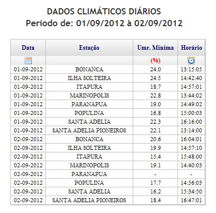 Durante as últimas semanas a Área de Hidráulica e Irrigação da UNESP Ilha Solteira vem alertando sobre a baixa excessiva da umidade relativa do ar. Chegando dia 3 de seembro, aos 73 dias sem chuva, desde o dia 1º desse mês, algumas estações passaram a registrar mínimas para essa variável climática inferiores a 20%, caracterizando estado de alerta devido às consequências desse fenômeno.