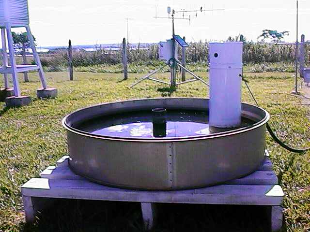 Detalhe do Tanque Classe A, do evaporímetro e estação agrometeorológica automatizada (CR23X)