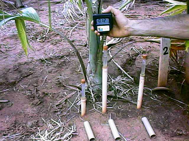 Detalhe da bateria de tênsiometros a 20, 30 e 70 cm de profundidade e leitura de campo pelo tensímetro (bar)