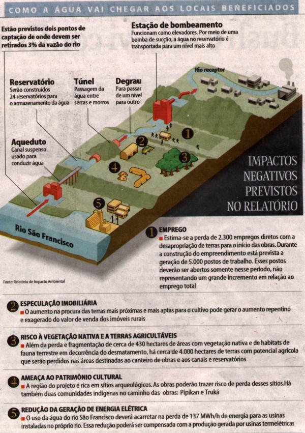 Esses são apenas dois dos efeitos negativos da obra listados no Rima (Relatório de Impacto Ambiental) encomendado pelo Ministério da Integração Nacional. O documento, disponível no endereço eletrônico do ministério, é o primeiro passo para o licenciamento ambiental em análise no IBAMA (Instituto Brasileiro do Meio Ambiente e dos Recursos Naturais Renováveis). Embora não haja prazo para a licença sair, o governo espera começar a obra no início de 2005, com o R$ 1,073 bilhão que o projeto de Orçamento lhe destina no ano que vem. Ao final de 136 páginas de considerações sobre prós e contras, o Relatório de Impacto Ambiental afirma que a transposição das águas do São Francisco "apresenta uma solução eficiente e estruturante para aumentar a oferta de água" na região da seca. Os contras (maioria entre 23 impactos considerados "mais relevantes") começam pela perda de 2.300 empregos diretos durante a desapropriação de terras, antes do início das obras. O Rima calcula que 3.500 pessoas tenham de ser remanejadas para dar espaço aos canteiros de obras e à construção dos canais, estações de bombeamento de água, aquedutos, túneis e reservatórios. "Durante a construção do empreendimento, está prevista a geração de cerca de 5.000 postos de trabalho. Esses postos deverão ser abertos somente nesse período, não representando um grande incremento em relação ao emprego total", diz o texto, que recomenda às empreiteiras a contratação de trabalhadores das próprias comunidades para a obra, cuja duração prevista é de quatro anos. Depois de pronta, a obra permitiria a criação de 240 mil empregos diretos e indiretos em projetos de irrigação e, com isso, reduziria a migração para os centros urbanos. A redução em 35% do êxodo rural previsto para acontecer até 2025 é uma das principais justificativas do projeto e foi mencionada na mensagem do presidente Lula ao Congresso. Mais