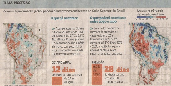 Numa das primeiras modelagens do gênero feitas para a América do Sul, um grupo do Inpe (Instituto Nacional de Pesquisas Espaciais) e da Universidade de Reading (Reino Unido) estima que o aumento de temperatura, entre 2070 e 2100, poderá produzir mais 16 dias no ano com chuvas além de 10 milímetros no sudeste do continente. Chuvas com essa intensidade em um só dia são consideradas eventos meteorológicos extremos e, em cidades como a capital paulista, também são sinônimo de caos.