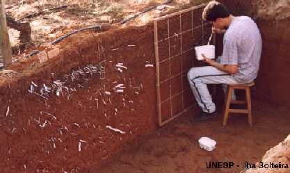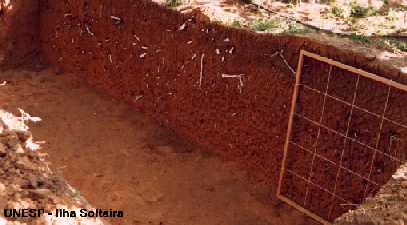 | FOTO 33 - Visão geral da trincheira feita para avaliar o sistema radicular da videira. | FOTO 34 - Bolsista trabalhando na pintura das raízes para avaliação do sistema radicular. |