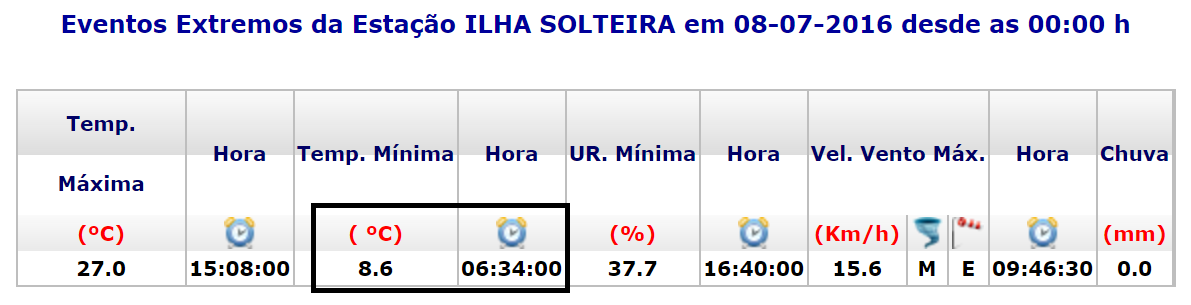 -------------------------------------------------------------------------------------------------- Com até 37 dias com estações agrometeorológicas automáticas operadas pela Área de Hidráulica e Irrigação da UNESP Ilha Solteira sem registrarem chuvas maiores do que 10 mm em toda região Noroeste Paulista as temperaturas voltaram a cair, impondo temperaturas muito baixas para a região caracterizada por inverno ameno e as mais altas temperaturas do Estado de São Paulo. Depois de uma semana com temperaturas confortáveis, ontem, em Marinópolis a temperatura chegou a 5,9ºC e hoje pela manhã, as 06:51 horas, a população sentiu 4,9ºC. Temperaturas iguais a esta ou menores foram registradas pela Rede Agrometeorológica do Noroeste Paulista em apenas 0,25% dos dias, sendo igual a essa registrado em 05 de agosto de 2011. Marinópolis também sente as consequências de 31 dias sem chuvas, e neste período, a evapotranspiração acumulada está em 84 mm, com média 2,6 mm/dia. Evapotranspiração é a perda de água por transpiração das plantas e evaporação do solo e que deve ser reposta pelas chuvas ou pelos sistemas de irrigação para a máxima produtividade. Com déficit hídrico solo e os preços do feijão e milho em alta, os sistemas de irrigação na região operam em plena capacidade para garantir a lucratividade da produção dos alimentos aos irrigantes. Pereira Barreto – Estação Bonança é a região com maior número de dias sem chuvas, já são 37 dias. A evapotranspiração média no mês de julho tem o maior valor em Pereira Barreto – Estação Santa Adélia com 3,7 mm/dia e o menor valor em Sud Mennucci com 2,4 mm/dia, conforme se observa nos dados disponíveis no Canal CLIMA da UNESP Ilha Solteira hospedado em http://clima.feis.unesp.br, com atualização a cada cinco minutos. Em Ilha Solteira as temperaturas se mantém amenas durante o dia, mas no início das manhã são bastante baixas. Ontem foi de 8,6ºC às 6:34 horas, quando iguais a esta ou mais baixas ocorreram em apenas 0,9% dos dias, sendo a última vez em 13 de junho deste ano. Hoje a temperatura mínima ficou em 10,8ºC, registrada pela Área de Hidráulica e Irrigação da UNESP Ilha Solteira às 04:49 horas. A temperatura começou a cair já a partir do domingo e na quinta-feira começou a cair em todo o Noroeste Paulista, conforme ilustra o gráfico do mês.A menor temperatura mínima média ficou em 12,8ºC em Marinópolis e a mais alta foi registrada em Pereira Barreto – Estação Santa Adélia com 16ºC. Se ligue na informação sobre a agricultura irrigada e a agroclimatologia A Área de Hidráulica e Irrigação da UNESP Ilha Solteira disponibiliza as variáveis climáticas coletadas pela Rede Agrometeorológica do Noroeste Paulista através do Canal CLIMA da UNESP Ilha Solteira (http://clima.feis.unesp.br) de forma livre e gratuita e além de dar suporte ao irrigante para que ele pratique o adequado manejo da irrigação através da estimativa da evapotranspiração, oferece o acesso de dados para qualquer pessoa que deseja saber mais sobre o clima no Noroeste Paulista. A atualização de dados é feita a cada cinco minutos, com gráficos, figuras, tabelas, mapas e ainda o banco de dados histórico das oito estações automáticas. Já a Imprensa, Internautas e demais interessados podem receber informações climáticas e os resultados das pesquisas e demais atividades desenvolvidas através do press-releases preparados pela Área de Hidráulica e Irrigação da UNESP Ilha Solteira. O cadastro deve ser feito em http://www.feis.unesp.br/irrigacao/faleconosco.php SERVIÇO – Canais de Comunicação operados pela UNESP Ilha Solteira: Jornal Dia Dia, 09 de julho de 2016. Portal UNESP, 08 de julho de 2016.