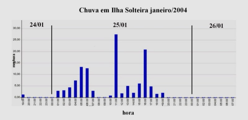 por metro quadrado. Porém no domingo chuvas intensas foram registradas, totalizando 118,6 milímetros causando grandes transtornos à população. Foi registrada uma morte na Rodovia do Barrageiros devido à uma acidente automobilístico. Também esta rodovia perto se Ilha Solteira se encontra interrompida devido à força da água que ultrapassou a pista e rompeu o asfalto. O início da precipitação decorrente da instabilidade que chegou na cidade se deu por volta das 19:00 horas do dia 24/01, mantendo níveis abaixo de 2mm. Na primeira hora do domingo dia 25/01, dia mais chuvoso da semana, os níveis começaram a se elevar, com pico maior de chuva às 11:00 horas quando foi registrado 27mm/hora, sendo registrado um total de 118,6mm durante o dia. Apesar das intensas chuvas, o total de chuva registrado em janeiro - 152,6 mm - é inferior à média histórica da região que é de 217 mm/mês. No mês de janeiro de 2003 as chuvas totalizaram 363 mm, mas em nenhum dia se registrou uma intensidade tão grande como registrada neste domingo. Naquele mês, no dia 23 de janeiro de 2003, foi registrada a maior intensidade de chuva, totalizando 79,5 mm/dia. Do ponto de vista da agricultura, a evapotranspiração de referência, calculada por Penman-Monteith, até o dia 25 de janeiro contabiliza 118,6 mm, contra chuvas de 152,6 mm, gerando excesso de água no solo, que será utilizado para enchimento de lagos, represas e reservatórios em geral, além do abastecimento do lençol freático. Condições atuais: A UNESP Ilha Solteira, através do Portal da Área de Hidráulica e Irrigação mantém um serviço TEMPO AGORA, com atualização a cada cinco minutos das condições agroclimatológicas da região noroeste do Estado de São Paulo. Neste momento (12:25 horas): em Ilha Solteira a temperatura é de 26,1 graus Celsius, a umidade relativa está em 75%, ventos fracos vindo de oeste (271 graus), radiação global até o momento de 4,1 MJ/m².dia e evapotranspiração de 0,9 mm/dia. Não foi registrada chuva nesta segunda-feira. Saiba como foi o tempo na semana passada Ainda segundo a Área de Hidráulica e Irrigação da UNESP Ilha Solteira que opera a estação agrometeorológica automática, com leituras a cada dez segundos, foram essas as condições climáticas na semana que passou: Temperatura Mais ALTA da Semana: sexta-feira, 23 de janeiro de 2004 às 14:55 horas = 32,5 °C Mais BAIXA da Semana: domingo, 25 de janeiro de 2004 às 16:05 horas = 16,6 °C MÉDIA da Semana: 25,9 °C Umidade Relativa Mais ALTA da Semana: domingo, 25 de janeiro de 2004 às 18:15 horas = 97,1 % Mais BAIXA da Semana: segunda-feira, 19 de janeiro de 2004 às 15:09 horas = 45,1 % MÉDIA da Semana: 75,68 % Evapotranspiração de Referência (Penman-Monteith) Mais ALTA da Semana: domingo, 24 de janeiro de 2004 = 5,1 mm/dia Mais BAIXA da Semana: domingo, 25 de janeiro de 2004 = 1,2 mm/dia MÉDIA da Semana: 3,8 mm/dia Velocidade e Direção do Vento MAIOR Velocidade do Vento da Semana: quinta-feira, 22 de janeiro de 2004 às 15:24 horas = 7,47 m/s = 27 km/hora MÉDIA da Velocidade do Vento da Semana: 1,7 m/s Direção do Vento Predominante: 84 ° - Ventos vindo de oeste Chuva Dia da Semana que MAIS Choveu: sexta-feira, 25 de janeiro de 2004 = 118,6 mm TOTAL de Chuvas no mês de janeiro: 152,6 mm Serviço: Maiores informações em: www.feis.unesp.br/irrigacao/irrigacao.php Condições climáticas atuais em Ilha Solteira (Tempo Real) - Sistema Tempo Agora: www.feis.unesp.br/irrigacao/tempoagora.php |