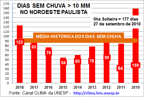 Deveríamos não nos impressionarmos tanto com esta situação, afinal, é previsível! Em 2010, o município de Ilha Solteira registrou impressionantes 177 dias sem chuva e estamos em média com 91 dias sem chuvas na região, pois 25% dos municípios registram menos que cem dias sem chuva e em número de dias uma situação que poderia ser confundida e acreditarmos que a situação é menos desfavorável que em 2017, quando em média, foram 93 dias sem chuvas e apenas Populina, registrou 132 dias sem chuvas, mas a maioria dos municípios ficou entre 83 e 88 dias sem chuvas. Isso é matemática!
